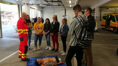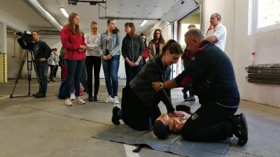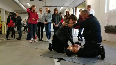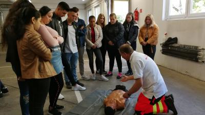 Ha a keringés nem elégséges, a segítséghívást követően érdemes elkezdeni az újraélesztést. 30 mellkaskompresszió után 2 szájon át befújást kell elvégezni. A Szeberény Gusztáv Adolf Evangélikus Gimnázium diákjai érdeklődve figyelték és tanulták a szükséges mozdulatokat, amelyeket pár perc alatt mindenki elsajátított.