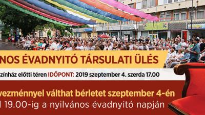 A Békéscsabai Jókai Színház szeptember 4-én 17 órától tartja nyilvános évadnyitó társulati ülését. Ezen a napon 15-től 19 óráig a 2019/2020-as évadra szóló bérleteket 20 százalék kedvezménnyel lehet megvásárolni.