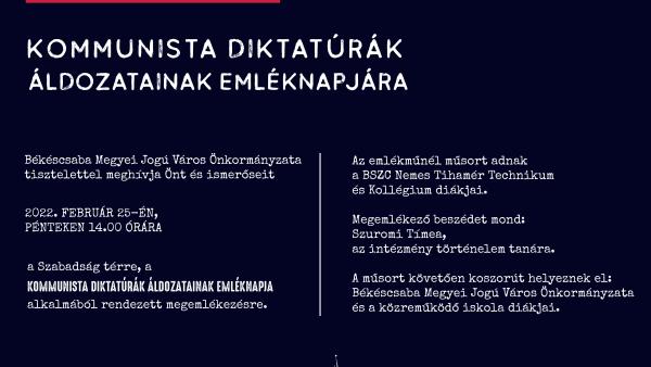 Békéscsaba önkormányzata megemlékezést tartott a kommunista diktatúrák áldozatainak emléknapja alkalmából. Az áldozatok Szabadság téri emlékművénél tartott megemlékezésen a Vízmű diákjai adtak műsort.