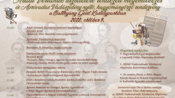 A kondorosi önkormányzat, az Alföldi Vadásztársulat Közhasznú Alapítvány, valamint a Dérczy Ferenc Könyvtár és Közösségi Ház közös megemlékezést tartott az aradi vértanúk tiszteletére a Batthyány-Geist kastélyparkban, szombaton. Az esemény nem csak főhajtás, hanem egyben ünnep is volt, a résztvevők ugyanis egyben az apróvadas vadászidény nyitó- és hagyományőrző rendezvényére is meghívást kaptak.