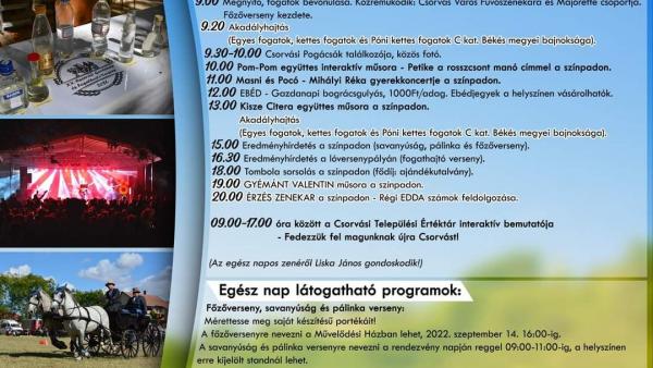 Fogathajtók C kategóriás Békés megyei bajnoksága, veterán mezőgazdasági gépek és motorok felvonulása, főzőverseny, csorvási pogácsák találkozója, színpadi műsorok és sok kísérőprogram is várja azokat akiket, szeptember 17-én Csorvásra látogatnak.