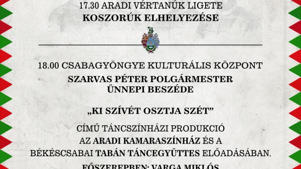 Békéscsaba Megyei Jogú Város Önkormányzata október 23-án az 1956-os forradalom és szabadságharc tiszteletére megemlékezést tart a Nagy Imre téren.