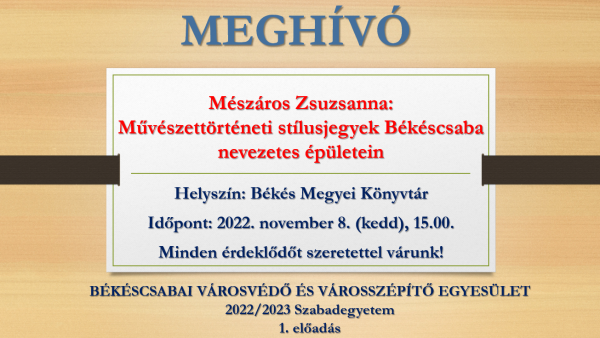 November 8-án 15 órakor tart előadást a Békés Megyei Könyvtárban Mészáros Zsuzsanna művészettörténész "Művészettörténeti stílusjegyek Békéscsaba nevezetes épületein" címmel, mely a Békéscsabai Városvédő és Városszépítő Egyesület 2022/2023. évi Szabadegyetemének első programja.
